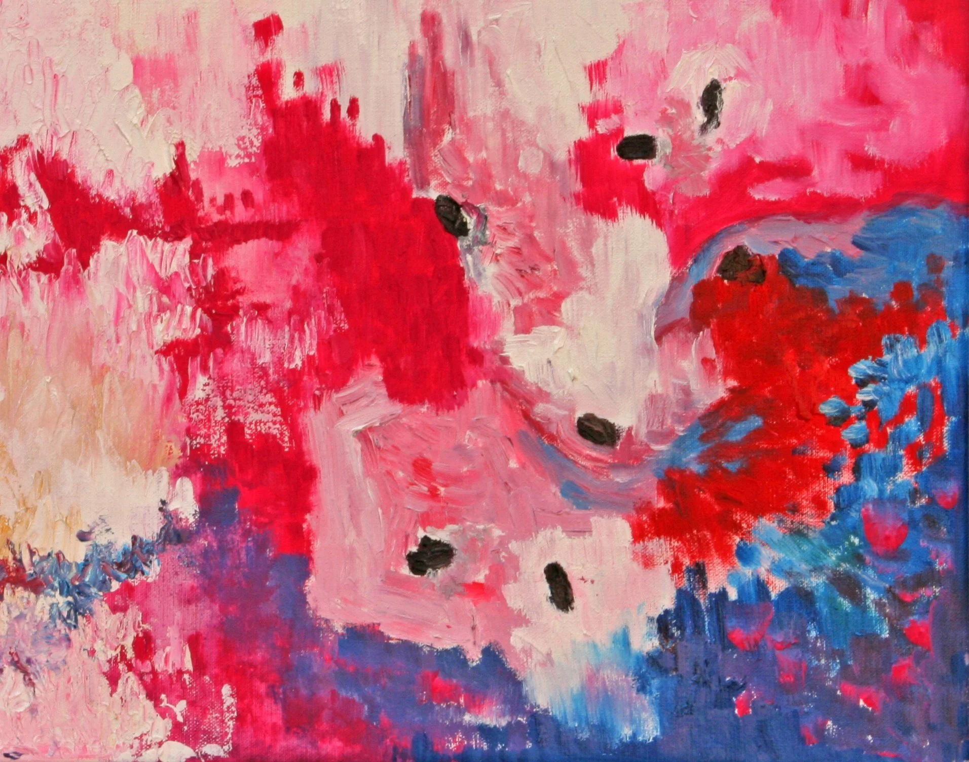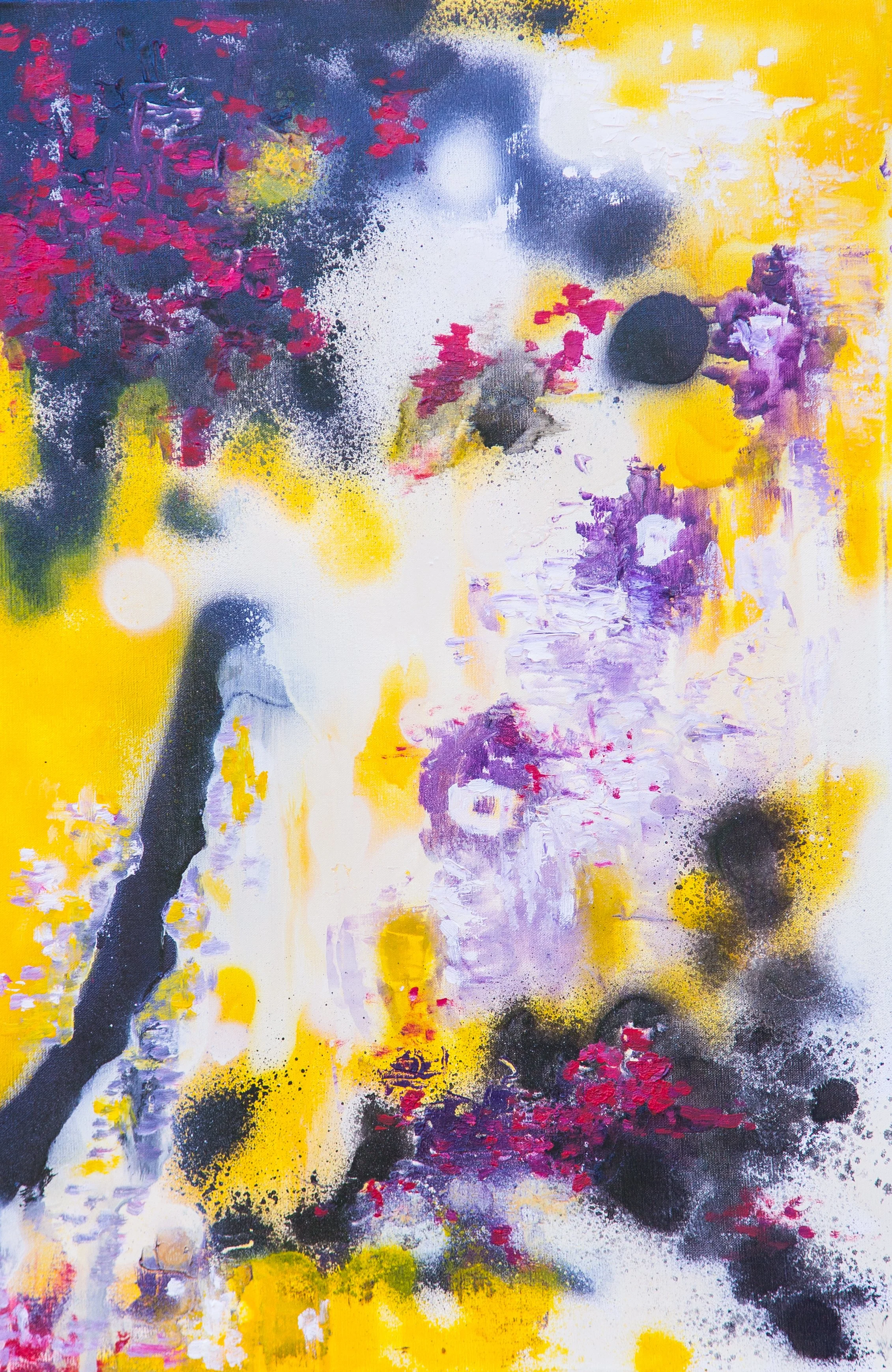 Most of her paintings are done in oil and synthetic paints, but she also creates watercolors and collages.